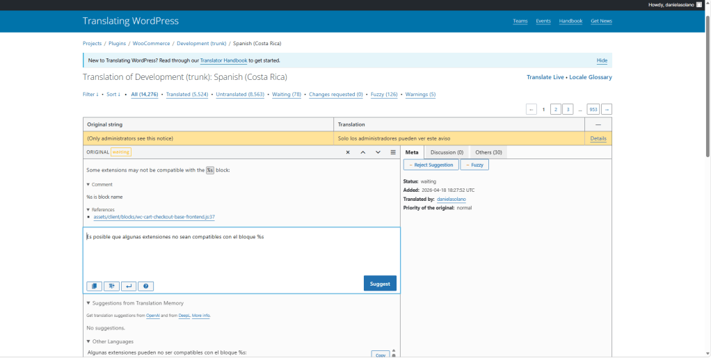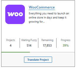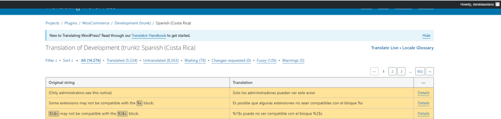 Para dar inicio a mi contribucion, ingresé a la plataforma translate.wordpress.org y accedí al locale Spanish (Costa Rica) (es_CR). Luego, seleccioné un el plugin de WooComerce el cual tiene un progreso de 39% con muchas cadenas de texto disponibles para traducir.